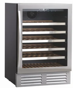 Opis: Chłodziarka idealna do prezentacji i przechowywania wina Sterowana za pomocą cyfrowego panelu System chłodzenia powietrzem Front urządzenia wykonany z przyciemnianego szkła Obudowa ze stali nierdzewnej w kolorze czarnym Bukowe, wyjmowane półki w komplecie Wewnętrzne oświetlenie LED Drzwi otwierane na prawą stronę Możliwa zmiana kierunku otwierania drzwi Urządzenie przeznaczone wyłącznie do przechowywania wina Parametry techniczne: Wymiary zewnętrzne [mm]: 595x572x867 Pojemność : 146 Ilość butelek : 46 Ilość półek:
