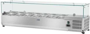 Cechy: . Szybkie chłodzenie dzięki kompresorowi o mocy 120W. Duża pojemność 45 l (miejsce na 7 pojemników GN 1/4). Szklana osłona chroniąca przed czynnikami zewnętrznymi. Automatyczny termostat utrzymujący temperaturę od 2 do 10°C. Obudowa wysokiej jakości ze stali nierdzewnej Nadstawa chłodnicza - 160 x 33 cm Nadstawa chłodnicza zapewnia świeżość oraz atrakcyjny wygląd produktów spożywczych, dzięki utrzymywaniu ich w niskiej temperaturze.