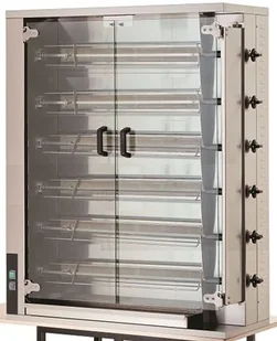 Opis: Profesjonalny gazowy rożen do opiekania drobiu, dziczyzny i golonki Korpus urządzenia wykonany ze stali nierdzewnej Przestronna komora grzewcza z otwieraną szybą frontową wykonaną ze szkła hartowanego Dobra izolacja cieplna Niezależne sterowanie każdego z palników Drzwiczki z nienagrzewającymi się uchwytami Wysokiej jakości elementy grzewcze umieszczone za rożnami Prosty w obsłudze Wewnętrzne oświetlenie komory ułatwiające kontrolę poziomu pieczenia Wyjmowana taca ociekowa na tłuszcz i resztki Prawe drzwi otwierane wraz z obudową dla ułatwienia wkładania rusztów Parametry techniczne: Wymiary zewnętrzne [mm]: 1150x550x1520 Ilość rożen [szt.]: 6 Ilość palników [szt.]: 6 Pojemność [szt.]:
