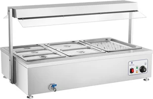Sprzęt umożliwiający podgrzewanie i utrzymywanie optymalnej temperatury dań i przekąsek dysponuje wydajnym elementem grzewczym oraz lampą halogenową z trzema żarówkami. 6 pojemników GN pozwala serwować spore ilości potraw i przekąsek, np. ziemniaków, mięs, wędlin, sosów, zup, gulaszy, ryżu. Podgrzewacz do potraw Royal Catering RCBM-6WA - charakterystyka Moc całkowita bemaru RCBM-6WA wynosi 2900 W. Element grzewczy 2000 W podgrzewa potrawy od spodu, zaś równomierne podgrzewanie od góry następuje dzięki ciepłu dostarczanemu przez lampę halogenową 900 W (3 żarówki 300 W).