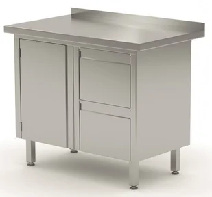 - Wysokiej jakości stół nierdzewny z blatem roboczym, modułem szuflad i szafką z drzwiami na zawiasach, wykonany ze stali nierdzewnej AISI 430 (opcjonalnie AISI 304)
