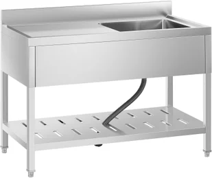 Gastronomiczny stół ze zlewem Royal Catering Stół ze zlewem marki Royal Catering stanowi świetne wyposażenie każdej profesjonalnej kuchni, ponieważ nie tylko umożliwia umycie naczyń, ale i pozwala przechować niezbędne przybory kuchenne. Model RCSSS-120X60-S poza umywalką wyposażono też w pojemną półkę. Dlatego sprawdzi się w restauracjach, hotelach, barach, szkołach, szpitalach, a nawet w laboratoriach. Zlew jednokomorowy ze stali nierdzewnej RCSSS-120X60-S - opis Głęboki jednokomorowy zlew o wymiarach 490 x 420 x 245 mm pomieści nawet duże naczynia jak blachy do pieczenia czy garnki. Wysokie ścianki zapobiegną rozchlapywaniu wody.