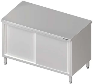 Stół roboczy z szafką z drzwiami suwanymi przelotowy wykonany ze stali nierdzewnej. Brak rantu tylnego - stół centralny. Przestawna środkowa półka. Konstrukcja spawana. Blat stołu z blachy o grubości 1 mm dodatkowo wzmocniony od spodu podwójnie laminowaną płytą o grubości 18 mm.