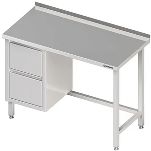 Stół roboczy z blokiem szuflad po lewej stronie wykonany ze stali nierdzewnej. Konstrukcja spawana. Blat stołu z blachy o grubości 1 mm dodatkowo wzmocniony od spodu podwójnie laminowaną płytą o grubości 18 mm. Obrzeże płyty osłonięte metalowym profilem, co zabezpiecza przed dostaniem się wilgoci . Grubość blatu wynosi 4 cm.
