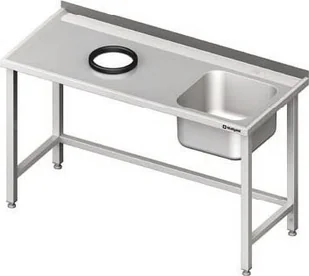 Stół ze zlewem i otworem na odpadki 1500×600×850 mm wykonany z wysokiej jakości stali nierdzewnej. Wysyłany w formie spawanej. Gumowa osłonka otworu o wewnętrznej średnicy 165 mm. Należy podać wymiary stołu i położenie otworu. Otwór pod baterię o średnicy 33 mm (zaślepiony) na środku komory.