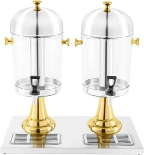 Podwójny zbiornik ma pojemność 2 x 8 l. Wewnątrz każdego dozownika znajduje się rurka na pokruszony lód, pozwalająca schłodzić napój. Przezroczyste ścianki pozwalają wyeksponować zawartość oraz na bieżąco kontrolować ilość płynów. Łatwą obsługę zapewniają kraniki z wygodnym mechanizmem naciskowym. Boczne rączki ułatwiają przenoszenie a pokrywa z uchwytem chroni wnętrze. Ociekacz pozwala zachować czystość na blacie roboczym.