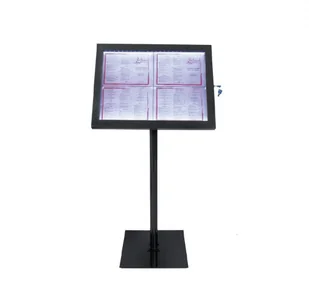 Podświetlane menu | 65x10x(H)120cm, Menu z podświetleniem LED. Wykonane zostało z polakierowanej na czarno stali, która odporna jest na warunki pogodowe. Część ekspozycyjną można zamocować pionowo lub poziomo na ścianie lub na załączonym stojaku. Działa na 4 baterie AA, prąd (5 metrowy przewód zasilający) lub akumulator (DL182, sprzedawany oddzielnie).