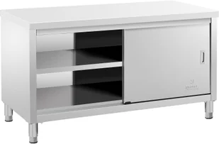 Nierdzewny stół roboczy z szafką Royal Catering W profesjonalnej kuchni nie może zabraknąć wysokiej jakości mebli ze stali nierdzewnej. Doskonałym przykładem jest stół roboczy z szafką marki Royal Catering. Model RCSSCB-150X70-E nie tylko posłuży jako blat do przyrządzania dań, ale i pozwoli przechować sprzęty oraz składniki. Gastronomiczny stół z przesuwnymi drzwiami RCSSCB-150X70-E - opis Wykonanie ze stali nierdzewnej sprawia, że stół roboczy idealnie nadaje się do wykorzystania w gastronomii. Wyróżnia się bowiem odpornością na korozję, działanie wody oraz uszkodzenia mechaniczne.