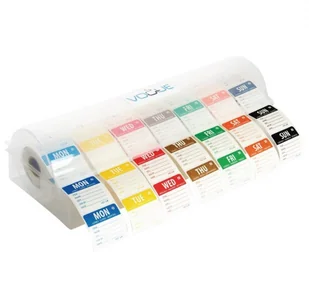 Dozownik do naklejek multi z 7 rolkami rozpuszczalnych naklejek dni tygodnia | 50mm, Zestaw naklejek w najlepszej cenie i łatwy w użyciu.