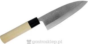Magoroku Saku Satake Nóż Deba 15,5 cm Tradycyjny japoński nóż z grubą, zwężającą się klingą, który służy do odgławiania i filetowania ryb w taki sposób, żeby nie uszkodzić ich delikatnego mięsa. W Japonii bywa często używany do sprawiania mięsa drobiowego, ale nie jest klasycznym tasakiem i nie powinno się nim mocno uderzać. Aby przeciąć ość, wystarczy lekko nacisnąć grzbiet noża i wykonać szybkie, precyzyjne cięcie. Ostry czubek i krótkie ostrze ułatwiają kontrolę ruchów, co jest szczególnie ważne, gdy trzeba dostać się nożem do ciasnych miejsc. Dane techniczne: