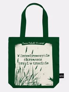 W Szczebrzeszynie chrząszcz brzmi w trzcinie! Ten najbardziej znany polski łamaniec językowy od lat sprawia problem naszym rodakom i wprawia w osłupienie obcokrajowców. Torba z chrząszczem radośnie brzmiącym w zielonej trzcinie to doskonały wybór na wyjazd zagraniczny, sprawdzi się także jako prezent dla obcokrajowca lub pamiątka z Polski. Uwaga! Nie ponosimy odpowiedzialności za połamane języki. Przed próbą przeczytania łamańca skonsultuj się z lekarzem lub farmaceutą. Learn Polish, it's easy! Gramatura 280 g/m² Nadruk wykonany metodą sitodruku (wysokiej jakości, bardzo trwały) 100% bawełna, torba ekologiczna Zapakowana w szykowną ekokopertę – idealny prezent dla obcokrajowca i nie tylko Idealna pamiątka z Polski Elegancka metka boczna W środku torby pojemna kieszonka na akcesoria Wymiary:
