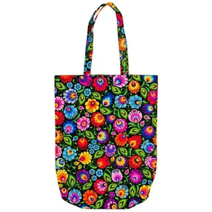 Czarna torba na zakupy z folkowym wzorem kwiatowym inspirowanym wycinanką łowicką. Wykonana z bawełny o gramaturze 200 g/m2. W środku posiada mała kieszonkę ...