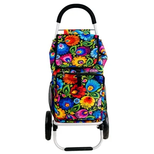 Wózek na zakupy folk - wzory łowickie Wielokolorowy wózek na zakupy o pojemności 42 litrów. Ozdobiony ludowym wzorem przedstawiającym kwiaty z wycinanki na czarnym tle. Udekorowany wyrazistym wzorem łowickim. Połączenie wygody, praktyczności i stylu, które sprawia, że codzienne wyprawy do sklepu stają się dużo łatwiejsze. Solidna konstrukcja oraz wytrzymałe kółka pozwalają go łatwo prowadzić zarówno po chodniku, jak i w centrum handlowym.