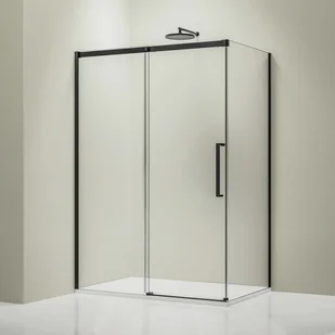 Prysznic narożny składa się z drzwi przesuwnych z funkcją cichego domykania i stałego panelu bocznego. Płynnie działający system rolek jest elegancko ukryty dzięki szerokiej aluminiowej listwie. Elegancki uchwyt wykonany z wytrzymałej stali nierdzewnej ma długość pozwalającą na swobodne korzystanie. Kabina prysznicowa może być instalowana na równi z podłożem lub na brodziku, a dzięki specjalnej konstrukcji zapewnia maksymalną wygodę użytkowania. Bezpieczne szkło hartowane posiada hydrofobową nanopowłokę dzięki której woda spływa bez pozostawiania osadów z mydła.