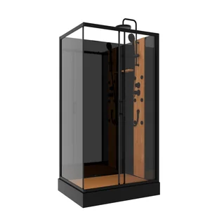 Kabina prysznicowa z hydromasażem, prostokątna, uniwersalna prawo/lewostronna, szyby przednie 4 mm. transparentne, szyby tylne 4 mm w kolorze czarnym, profile aluminiowe w kolorze czarnym, panel prysznicowy wykonany z drewna bambusowego z 6 dyszami do hydromasażu, z zestawem prysznicowym. Brodzik wysokości 15 cm z podłogą z drewna bambusowego, rolki górne i dolne podwójne. System szybkiego montażu. Kabina bez syfonu