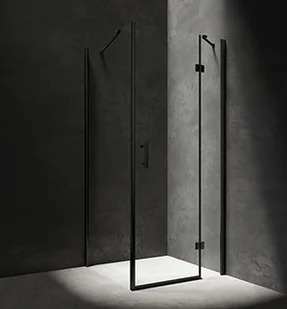 Specyfikacja techniczna: ścianka z drzwiami: 80 cm ścianka boczna: 90 cm wejście: 55 cm wysokość: 195 cm trójelementowa, jednoskrzydłowa, otwierana na zewnątrz szkło bezpieczne hartowane, grubość: 6 mm regulacja profilu: -2/+0 cm wsporniki, profile i uszczelki w kolorze czarnym listwa progowa zapobiega wyciekaniu wody mosiężne zawiasy uchwyt w kolorze czarnym