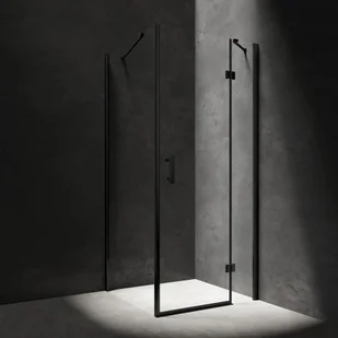 Specyfikacja techniczna: ścianka z drzwiami: 120 cm ścianka boczna: 100 cm wejście: 65 cm wysokość: 195 cm trójelementowa, jednoskrzydłowa, otwierana na zewnątrz szkło bezpieczne hartowane, grubość: 6 mm regulacja profilu: -2/+0 cm wsporniki, profile i uszczelki w kolorze czarnym matowym listwa progowa zapobiega wyciekaniu wody mosiężne zawiasy uchwyt w kolorze czarnym matowym
