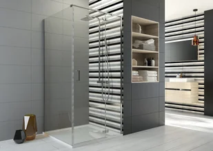 Wygodne otwieranie drzwi umożliwiają eleganckie dwupunktowe uchwyty. Produkt posiada nowy system wsporczy montowany na równo z linią drzwi. Stabilizuje on jego konkstrukcję i nadaje nowoczesnego charakteru. Regulowane profile przyścienne pozwalają na zniwelowanie krzywizny ściany. Produkt pozwala na stworzenie miejsca prysznicowego zarówno w mniejszej łazience jak i w dużym salonie kąpielowym.