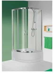 Kabina narożna półokrągła kpl-KP4/TX5b/165 z drzwiami rozsuwanymi posiada wypełnienie z bezpiecznego szkła hartowanego o grubości 5 mm z modyfikacją powierzchni szkła Glass Protect w standardzie. System jezdny oparty jest o zespół podwójnych rolek łożyskowych mocowanych w tafli szkła oraz podwójnych odpinanych rolek dolnych. Szczelność zapewnia uszczelka magnetyczna. Wygodne przesuwanie drzwi umożliwiają estetyczne, chromowane uchwyty, mogące pełnić również funkcję wieszaka. Kabina ma wysokość 165 cm i kompletowana jest z brodzikiem akrylowym o głębokości 25 cm, wyposażonym w funkcjonalne siedzisko oraz obudową.