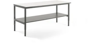 Stół roboczy z półką dolną, 2000x750 mm, blat biały laminat, szara rama. Stół do pakowania o trwałym designie. Wyposażony w półkę dolną. Rama z płynną ręczną regulacją wysokości. Dokup sprytne i funkcjonalne akcesoria (sprzedawane oddzielnie).