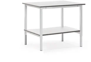 Stacja robocza z 24 mm blatem z wysokociśnieniowego, jasnoszarego lamiantu obramowany ciemnoszarym paskiem ABS. Maksymalne obciążenie do 400 kg równomiernie rozłożone. Dolna półka zapewnia dodatkową przestrzeń do przechowywania pod blatem roboczym. Możliwość uzupełnienia urządzenia o szeroką gamę akcesoriów do stacji roboczej, takich jak półki, panele narzędziowe, gniazda zasilające, uchywty do monitorów i stojaki na dokumenty.