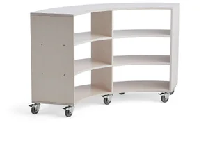 Niski regał na kołach z hamulcami. Idealny jako przegroda w pomieszczeniu. Łatwe przemieszczanie dzięki kołom. Regał jest podzielony na kilka pojemnych przegród z miejscem do ogólnego przechowywania, na zabawki itp. Praktyczny regał, który idealnie sprawdzi się w przedszkolu. Kształt pozwala umieścić regał w dowolnym miejscu w pomieszczeniu. Równie dobrze wygląda w środku pomieszczenia, jak i ustawiony przy ścianie.