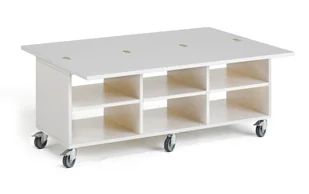 Przegrody można uzupełnić o szuflady, które są dostępne jako wyposażenie dodatkowe. Stół jest dodatkowo wyposażony w blokowane kółka, które sprawiają że łatwo można go przesuwać lub zablokować w miejscu.