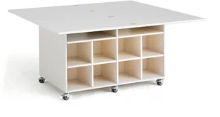Innowacyjny i wielofunkcyjny stół z przegrodami do przechowywania z wytrzymałym, składanym blatem z laminatu oraz ramą ze sklejki brzozowej barwionej na kolor biały. Wielofunkcyjny, praktyczny stół MOLLY idealnie sprawdzi się jako mebel w przedszkolnych salach. Posiada mnóstwo miejsca do przechowywania, wyposażony w przegrody o różnych rozmiarach. Blat stołu można wykorzystać zarówno przy rozłożonym jak i złożonym stole, w zależności od przeznaczenia do użycia. Wielofunkcyjny stół posiada wytrzymałą ramę wykonaną ze sklejki brzozowej barwionej na kolor biały. Dodaj do stołu wytrzymałe pudełka, sprzedawane jako wyposażenie dodatkowe.