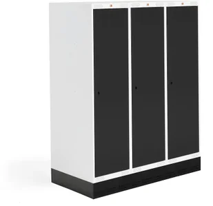 Niska szafka szkolna dla młodszych dzieci z trzema przegrodami pełnej wysokości. Każda szafka ma trzy niewielkie przegrody i drążek z wieszakami i podwójnym haczykiem. Rama i drzwi są wzmocnione. Nasze szafy sprzedajemy bez zamków (patrz akcesoria).