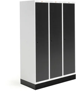 Szafka szkolna z trzema przegrodami pełnej wysokości. Każda przegroda jest wyposażona w trzy niewielkie półki i drążek na wieszaki z podwójnym haczykiem. Rama i drzwi są wzmocnione. Nasze szafy dostarczamy bez zamków (patrz akcesoria). Szafki szkolne Roz produkujemy we własnych fabrykach. Każda szafka jest pojemna i wytrzymała, dzięki czemu sprawdzi się w trudnym środowisku szkolnym.