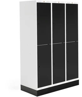 3-modułowa szafka szkolna z dwiema przegrodami w każdym module. Każda przegroda wyposażona w dwie niewielkie półki i drążek na wieszaki. Rama i drzwi wzmocnione. Otwory wentylacyjne w górnej i dolnej części. Nasze szafy dostarczamy bez zamków (patrz akcesoria). Szafki szkolne Roz produkujemy we własnych fabrykach. Każda szafka jest pojemna i wytrzymała, dzięki czemu sprawdzi się w trudnym środowisku szkolnym.