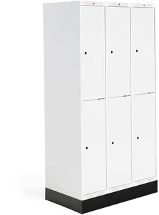 3-modułowa szafka szkolna z dwiema przegrodami w każdym module. Każda przegroda wyposażona w dwie niewielkie półki i drążek na wieszaki. Rama i drzwi wzmocnione. Otwory wentylacyjne w górnej i dolnej części. Nasze szafy dostarczamy bez zamków (patrz akcesoria). Szafki szkolne Roz produkujemy we własnych fabrykach. Każda szafka jest pojemna i wytrzymała, dzięki czemu sprawdzi się w trudnym środowisku szkolnym.