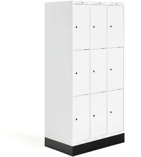 3-modułowa szafka szkolna z trzema przegrodami w każdym module. Każda przegroda wyposażona w półkę. Rama i drzwi wzmocnione. Otwory wentylacyjne w górnej i dolnej części. Nasze szafy dostarczamy bez zamków (patrz akcesoria). Szafki szkolne Roz produkujemy we własnych fabrykach. Każda szafka jest pojemna i wytrzymała, dzięki czemu sprawdzi się w trudnym środowisku szkolnym.