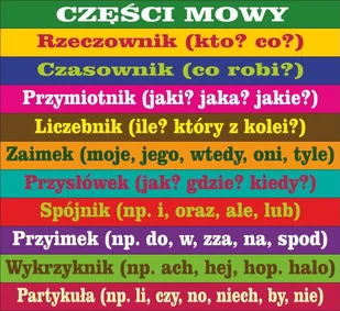 Wielokolorowe naklejki z częściami mowy do przyklejenia na schody. Komplet zawiera 11 elementów wymiarach 120 x 10 cm każda. Jedna część mowy jest na jednej naklejce. Wytrzymałe i odporne na zmywanie naklejki foliowe są dostępne w dwóch wersjach. Standardowa laminowana jest laminatem płynnym, natomiast specjalna, wzmocniona laminowana laminatem stałym (z warstwą folii wgrzaną termicznie).