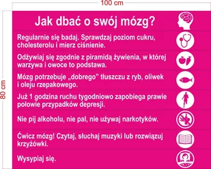 Kolorowe naklejki na schody z zasadami dbania o prawidłowe funkcjonowanie mózgu - 7 ważnych wskazówek, które każdy powinien znać. W komplecie jest 8 naklejek w rozmiarze 100 x 10 cm. Każdą z naklejek montuje się na podstopnicy schodów, tak aby była na wysokości oczu. Naklejki są wydrukowane na samoprzylepnej folii pokrytej płynnym laminatem, przez co są one odporne na zmywanie i dobrze przylegają do schodów. Naklejki na schody mogą być przyklejone do każdej powierzchni zarówno gładkich, jak i tych wykonanych np.