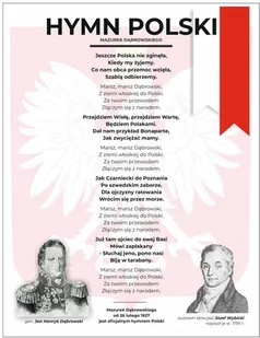 Ścienna naklejka szkolna przedstawiająca polski hymn narodowy - Mazurek Dąbrowskiego. Naklejka zawiera tekst hymn oraz notę biograficzną powstania utworu. Można ją umieścić na każdej gładkiej powierzchni - ścianie czy szybie. Jest to także świetny materiał, który przekazuje wartościowe treści edukacyjne dla najmłodszych. Dzięki specjalnej technice naniesienia kleju (w postaci punktów) możliwe jest przyklejenie produktu bez powstających bąbli.