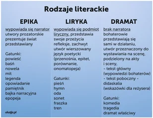 Naklejka przedstawiająca podstawowy sposób klasyfikacji dzieł literackich. Jest to podział ze względu na formę wypowiedzi, a jednocześnie budowę utworu. Naklejka jest przejrzysta, stanowi pomoc dydaktyczną, jak i ozdobę sali lekcyjnej. Można ją w każdym momencie odkleić i umieścić w innym miejscu. Dzięki specjalnej technice naniesienia kleju (w postaci punktów) możliwe jest przyklejenie produktu bez powstających bąbli.