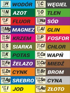 Pierwiastki chemiczne Kolorowe naklejki na schody z wybranymi pierwiastkami chemicznymi są drukowane na ekonomicznej folii samoprzylepnej, laminowane laminatem płynnym. W komplecie znajdują się 22 naklejki. Każda z nich ma wymiary 50x12 cm. Można wybrać wersję standardową bądź wzmocnioną. Wersja wzmocniona jest drukowana na innej folii, takiej która została przystosowana do bardziej wymagającej powierzchni i laminowanej laminatem stałym.