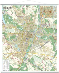 Ścienna mapa Poznania w skali 1:20 000 obejmująca również pobliskie cztery miasta: Luboń, Mosina, Puszczykowo i Swarzędz.