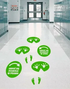 Zestaw naklejek z laminatem antypoślizgowym na podłogę- ślady żabki. Poszczególne elementy należy odkleić od arkusza i umieścić wedle potrzeb, tak by zabawa była wygodna oraz dopasowana do wzrostu i możliwości motorycznych dzieci. Rozmiar arkusza z naklejkami ma rozmiar 90x55 cm.