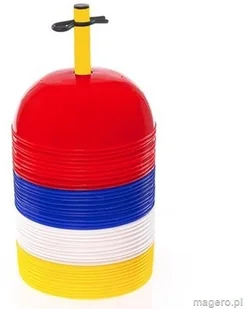 Talerze treningowe z otworem na szczycie wykonane z tworzywa sztucznego do różnego rodzaju treningów, ćwiczeń, gier i zabaw. W opakowaniu stojak oraz 40 pachołków w kolorach: czerwony, żółty, niebieski, biały.