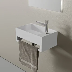 Umywalka ścienna PB2077 matowa biel - Odlew mineralny Solid Stone - Z wbudowanym uchwytem na ręcznik.