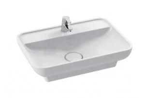 wymiary: 59,5x42x14,5cm kolor: biały materiał: ceramika kształt: prostokątna o zaokrąglonych krawędziach umywalka nablatowa z możliwością wpuszczenia w blat bez przelewu z otworem na baterię do kompletowania z zaślepką ceramiczną syfonu (0008) gwarancja producenta: 5 lat Uwaga: