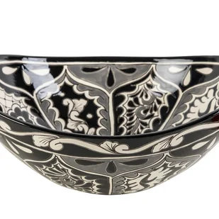 Ręcznie wykonana ceramiczna umywalka nablatowa – do użytku w łazience Ręcznie wykonana, z wykorzystaniem tradycyjnych technik, każda sztuka jest indywidualnie zdobiona, a wzory nakładane są ręcznie na całą powierzchnię, zarówno wewnątrz, jak i na zewnątrz. Umywalka posiada również wypukły wzór, tworzący subtelny efekt 3D, który podkreśla jej rzemieślniczy charakter i bogactwo wizualne. Dzięki smukłemu, lekko wygiętemu ku górze kształtowi, umywalka ta nadaje rzeźbiarski charakter i wyrafinowaną estetykę każdemu wnętrzu. Jej oryginalny design idealnie pasuje do wnętrz w stylu boho, etnicznym lub naturalnym. Najważniejsze cechy Ręcznie wykonana dekoracja Wzory tworzone ręcznie, zgodnie z tradycją Wykończenia widoczne ze wszystkich stron Unikalny wzór dekoracyjny, który tworzy indywidualną atmosferę Wyrazisty element dekoracyjny w łazience Wysokiej jakości materiały Wysokiej jakości szkliwiona ceramika Odporna na mikrozarysowania, wilgoć i środki czystości Kolory pozostają trwałe dzięki ochronnej glazurze Łatwa w utrzymaniu Nieporowata, higieniczna powierzchnia Nie wymaga specjalnych środków czyszczących Proste czyszczenie czystą wodą z delikatnym mydłem Funkcjonalna konstrukcja Wystarczająca pojemność dla komfortowego użytkowania Łatwy montaż na umywalce lub blacie Wyłącznie do użytku wewnętrznego Średnica otworu odpływowego: