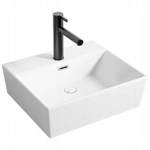 Ceramiczna | Z otworem na baterię | Nowoczesny design DANE TECHNICZNE Typ: umywalka nablatowa (stawiana) Materiał: ceramika sanitarna Kolor: biały, połysk Kształt: prostokątna Otwór na baterię: