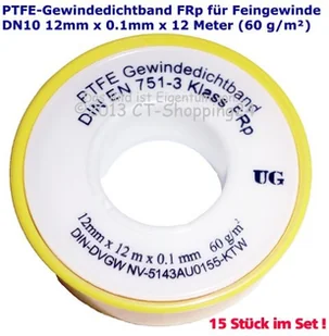 UG Taśma z PTFE taśma uszczelniająca zwój gwintu, w rolce (taśma teflonowa) FRp do drobnego gwintu DN10 zgodnie z normą DIN EN 751-3, 12mm x 0,1mm x 12m (60 g/m), biały