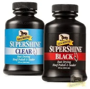 SuperShine Hoof Polish - (pasta i szczeliwo) - jest najlepiej sprzedającym się tego typu preparatem w Ameryce Północnej. Daje kopytom wspaniały lustrzany blask. Wysycha w mniej niż 60 sekund. Ta cecha, tzn. szybkie schnięcie, uniemożliwia przyklejanie się pyłu do kopyt.
