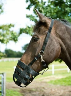 Kaganiec PLAIN firmy BUSSE. Do stosowania w przypadku konieczności zmniejszenia ilości pokarmu przyjmowanego przez konia. Nadaje się idealnie dla koni otyłych, z ochwatem itd. Wykonany z wytrzymałej parcianej taśmy. Dobra cyrkulacja powietrza.
