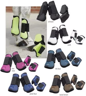 Anatomicznie dopasowany komplet ochraniaczy na 4 nogi. Warstwa zewnętrzna z elastycznego PVC. Zarówno obszyte brzegi jak i wewnętrzna warstwa wykonane z miękkiej gumy pokrytej przyjaznym dla skóry jersey''em. Zapinane na mocne rzepy. Wspaniałe wykończenie, bardzo wytrzymałe.
