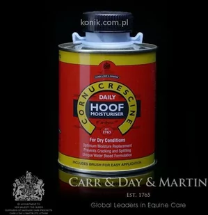 Preparat nawilżający do kopyt z pędzelkiem DAILY HOOF MOISTURISER - CARR&DAY&MARTINZaawansowana formuła na bazie wody, wnikająca głęboko w róg kopytowy, pomagająca uzupełnić niedobory wilgoci. Regularnie stosowany utrzymuje optymalny poziom nawilżenia. Przeznaczony do codziennego stosowania, do wszystkich rodzajów kopyt, szczególnie wysuszonych i kruchych. Idealny podczas gorącego, suchego sezonu. Łatwy w stosowaniu dzięki załączonemu pędzelkowi.